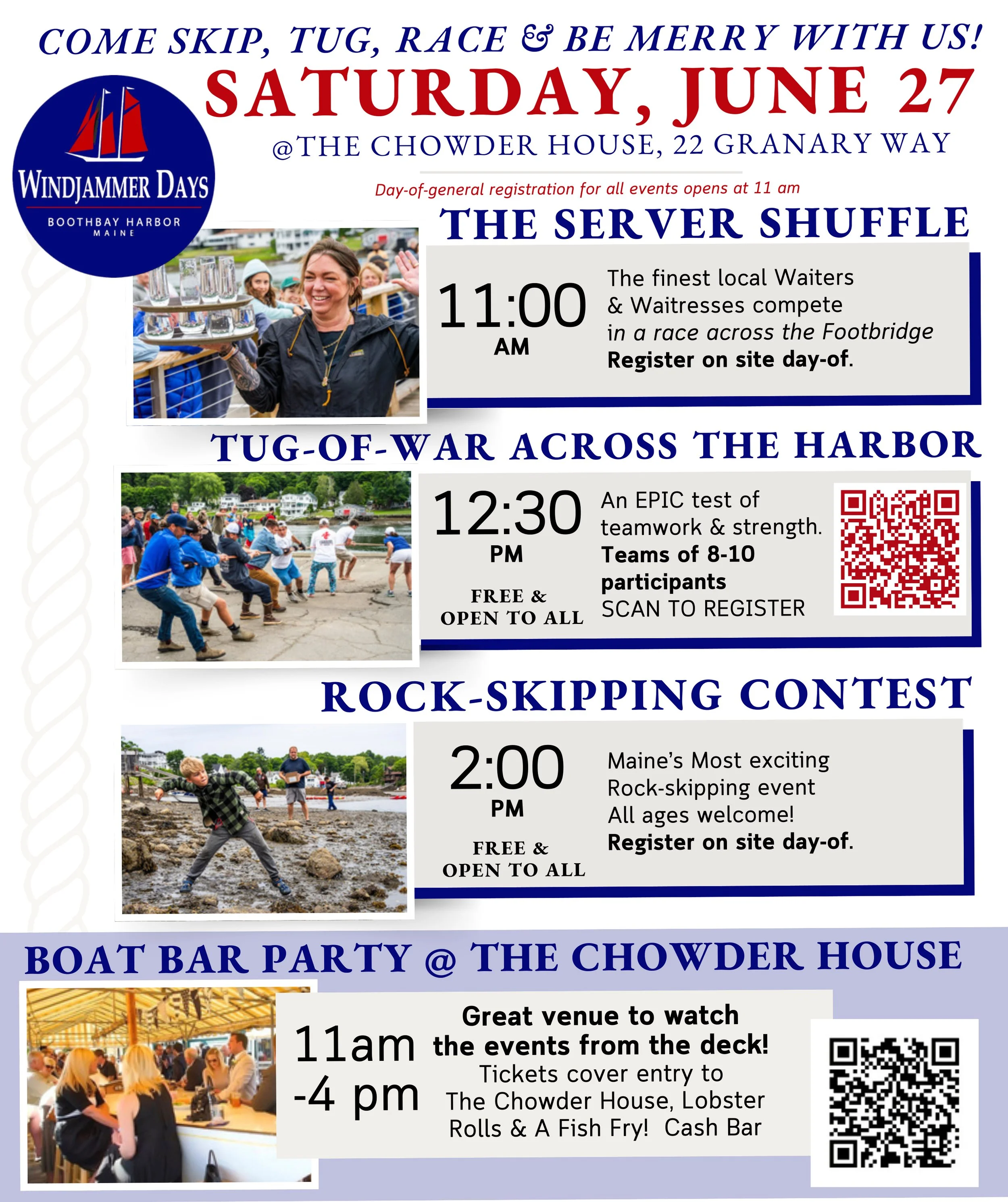 The Chowder House hosts the Boat Bar Party, a great venue from which to watch Windjammer Days family, fun filled events that close out the week of festivities! The events held throughout the day include a Rock Skipping Contest, Tug Across the Harbor and the Server Shuffle!